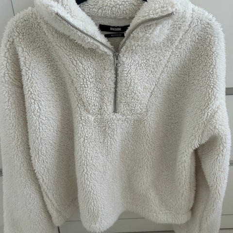 kremfarget teddyfleece-hettegenser med en halv glidelås og en O-ring på glidelåsen.