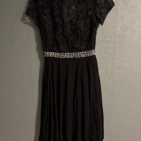 Sort kjole fra FLOYD str. 40 selges kr. 300. Strikk i ryggen. Lite brukt. Står størrelse 12 på lappen. Dette skal tilsvare størrelse 40.