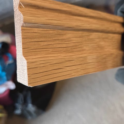 Gulvlister fra fire rom med en omkrets på totalt ca 45 meter - det kan trekkes fra for totalt seks dører (tre deler rom) og noe bak to garderober. Vil ikke bli målt opp eksakt lengde. Kan det være eik tresort?