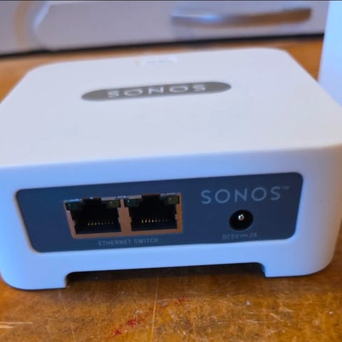 Sonos Bridge nettverkstilkobling i hvit farge. Enheten har porter for nettverkstilkobling og leveres med strømforsyning. Designet for å forbedre trådløs tilkobling i Sonos lydsystemer.