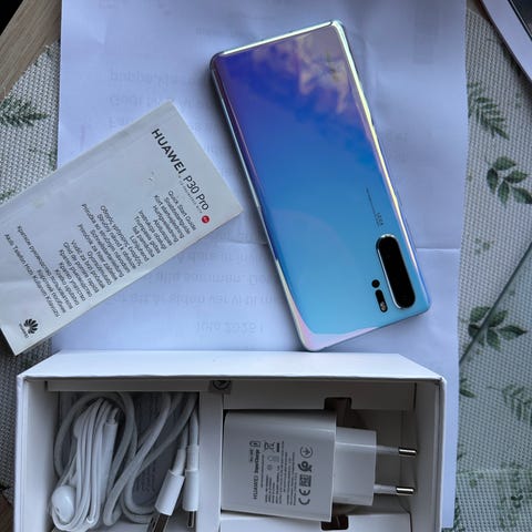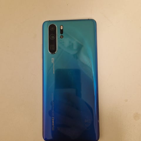 Huawei P30 Pro mobiltelefon med 128 GB lagringskapasitet. Telefonen har en blå farge og kommer med lader. Telefonen er pent brukt og det er lite skjønnhetsfeil på telefonen. Ingen sprekk eller knust.