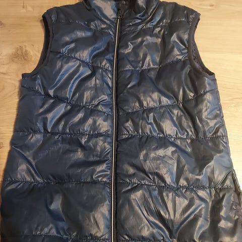 Vesten har ikke vært brukt, og kommer med lappen på, men den har fått en knøttliten rift i det ytterste stoffet, helt nederst bak.