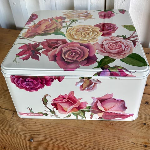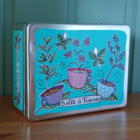 Rektangulær metall-boks med lyseblå bunn, rød fugl og gullfarger her og der. Nydelig boks! I kjent Sara Miller-stil :-)