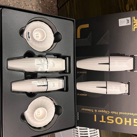 JRL Ghost 2 hårklippesett i hvit farge. Inkluderer hårklipper, trimmer og barbermaskin. Designet for hårklipp og barbering med tilbehør for presisjonsarbeid.