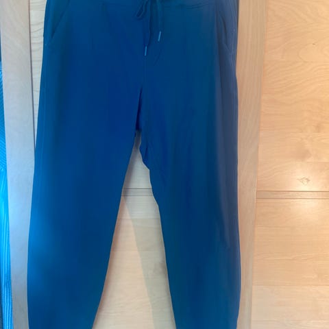 Joggebukser i marine farge for kvinner i størrelse XL. Buksen har snøring i midjen og er laget av et materiale med teksturert stoff på innsiden av bena, noe som kan gi ekstra komfort og bevegelsesfrihet. Lengde 101cm
