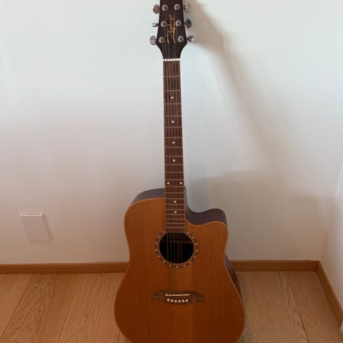 Akustisk gitar med naturtre finish. Gitaren har seks strenger og standard dreadnought-form. Den leveres med en myk gitar ryggsekk for transport og oppbevaring.