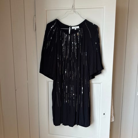 H&M i størrelse M, fargen svart. Kjolen har kort erme og dekorative detaljer i form av mønster og små pyntestener.