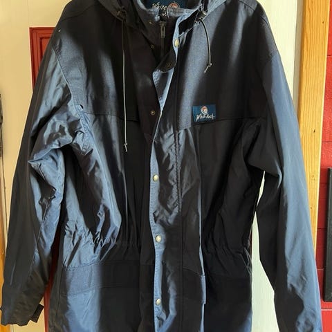 Romslig, tynn olajakke med dype lommer, hette i g snøring i bunn.