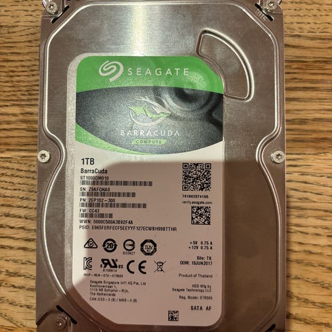 Seagate Barracuda 4TB harddisk med modell ST4000DM004. Harddisken har en lagringskapasitet på 4 terabyte og er beregnet for bruk i datamaskiner. Den har standard tilkoblinger og er egnet for lagring av store mengder data.