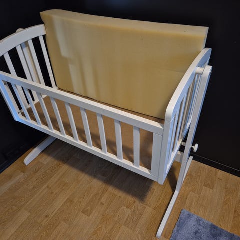 Moseskurv med vuggestativ. Vi har satt filt under slik at vugga kan skyves på uten å ripe opp gulvet. Lav vekt, så lett å løfte vugga rundt om i huset. Det samme gjelder babykurv med madrass. Lun seng som også fungerer som et babynest. Brukt som soveplass til tvillinger. Opplevde at de fikk lengre dupper i vuggen, ettersom den begynte å vugge litt av seg selv når baby begynte å bevege seg, og dermed ble vugget i søvn igjen uten at vi trengte å gjøre noe 👌🏻