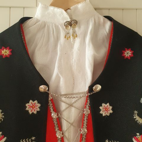 Komplett bunad fra Husfliden, Løland med håndsydd bunadskjorte i lin. Selges med oksydert sølv fra Jørgen Otteren. Stor halssølje, liten halssølje, maljer, beltespenne, kjede og sjalsølje. Veskelås i sølvplett. Nypris på sølvet er kr.31762.- pr. 15.02.26.