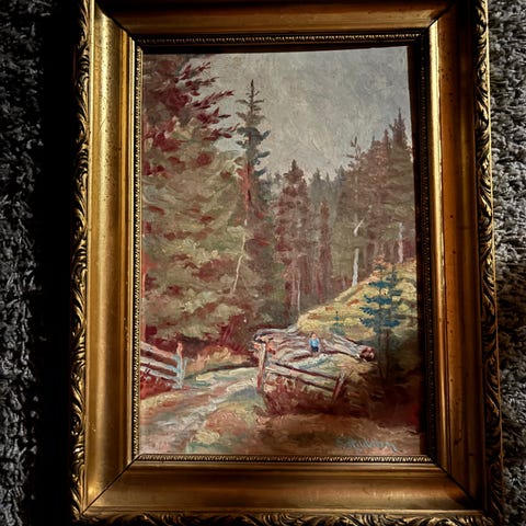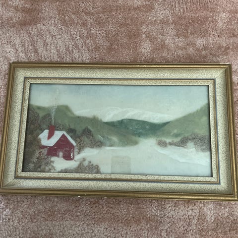 Vinterlandskap Oljemaleri på lerret med motiv av snødekt landskap og trær. Maleriet er innrammet i en brun treskjerm. Signert .