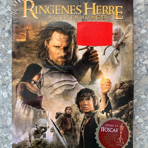 Le Seigneur des Anneaux Le Retour du Roi DVD Boks med lang versjon. Spesialutgave med flere DVD-er. Inneholder filmen Le Retour du Roi i en utvidet utgave. Boksens omslag er blått med gulltekst og illustrasjoner. Passer for samlere og fans av filmserien.