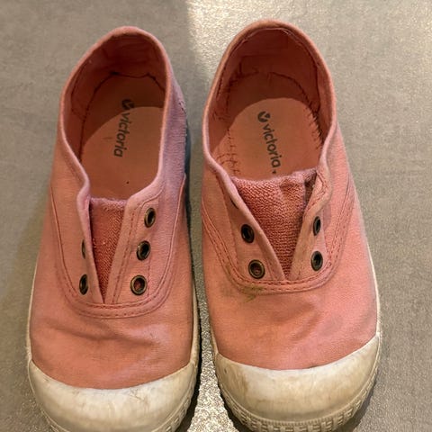 3 par godt brukte sneakers, tuppene på de hvite kavat er litt mer slitt da de er brukt til å bremse på balansesykkel.