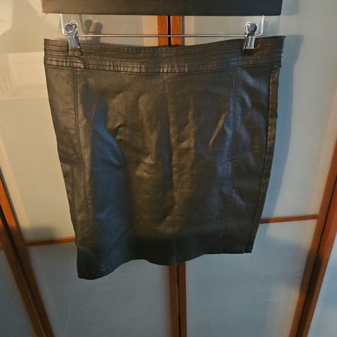 Floyd sort skinnskjørt (imitert skinn/PVC) størrelse XL. Skjørtet har splitt foran og bak og glidelås i siden. Flatterende lengde til under kneet (jeg er 170)