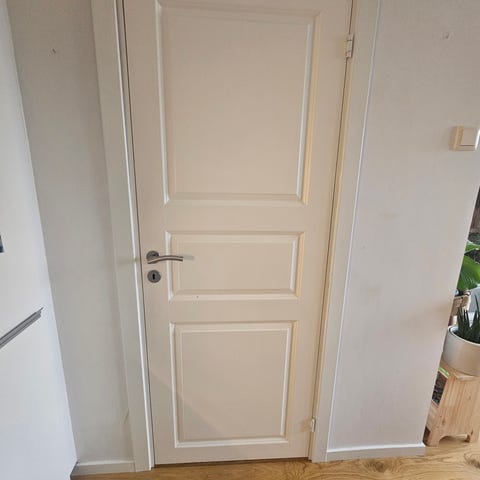 Innerdør i hvit farge med tre rektangulære paneler.80x200. Selges uten karm, og uten håndtak.Dvs døra er ca 72’5cm bred uten karm. Doria