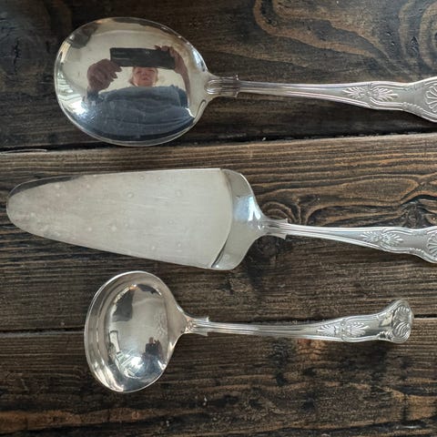 Selges et vakkert sett med klassiske sølvplettfat og skåler fra England.