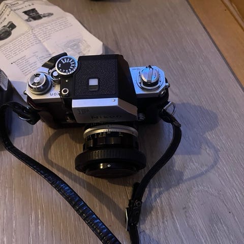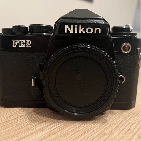 Ikonisk Nikon FE2 analogt kamera med manuell fokus og elektronisk lukker. Det er kjent for sin holdbarhet og er populært blant fotografer som ønsker å utforske analog fotografering. Du kan bruke dobbeleksponering, selvutløser og lysmåler fungerer som de skal. Det fungerer på batteri, men du kan bruke det i ekstrem kulde eller med tomt batteri med lukkertid 1/250 og B.