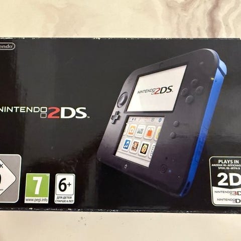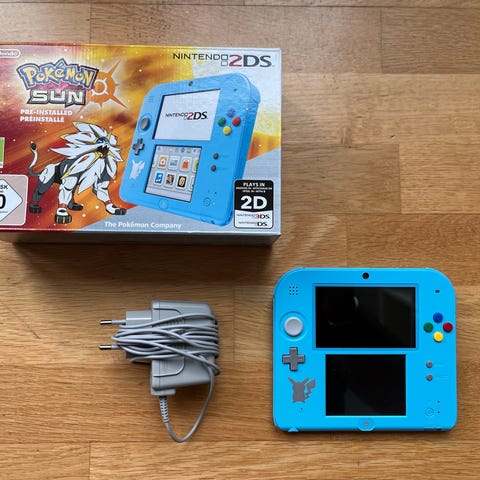 Selger en fin Nintendo 2DS med stylus, cover og 4GB lagringsdisk, i tillegg til ladekabel. Følger med New Super Mario Bros 2 digitalt.