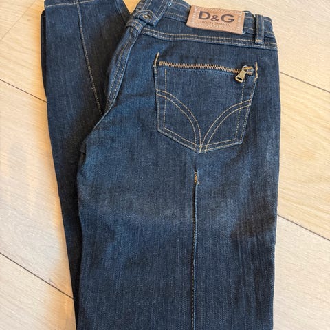 Dolce & Gabbana jeans i blå farge, størrelse W26 (svarende til S for kvinner). Laget av 98% bomull og 2% elastan. Jeansene har slitte detaljer og dekorative perler foran. Laget i Italia.