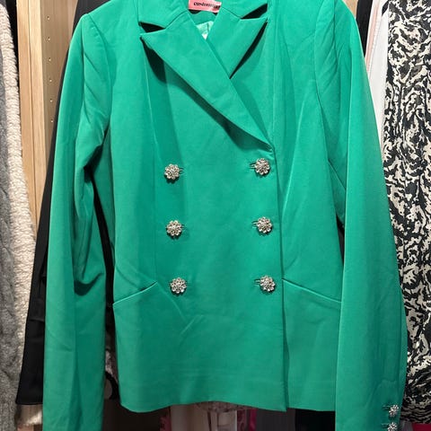 En blazer fra Costummade, str. S/36 i en fin grønnfarge med glitrende knapper.