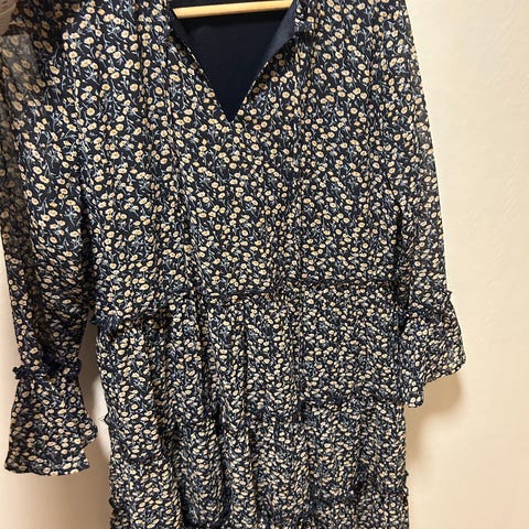 knapper til ca midje, volanger nederst erm mansjetter og 3 kapper i skjørtet (a-fasong)