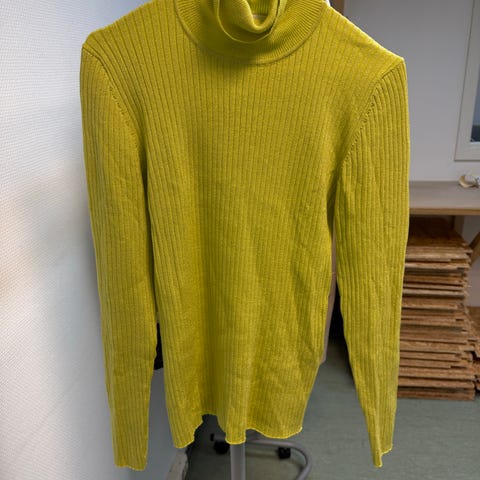 Vakker høyhalset genser, kun brukt 1 gang. Fikk dessverre leppestift et par steder rundt halsen, det meste gikk vekk med en runde i vaskemaskinen. Tror at med Vanish vil alt fjernes. Uansett ikke veldig synlig.