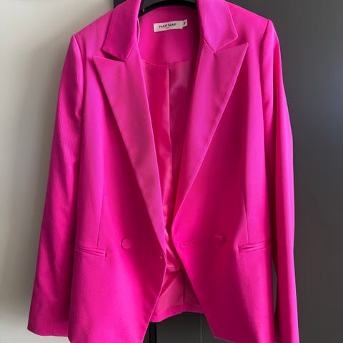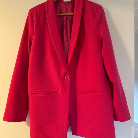 Marta blazer i rosa farge, størrelse One Size (M-XL ca). Blazeren har en knapp foran, to lommer.