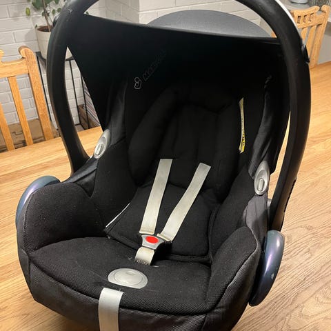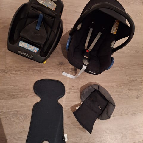 Maxi-Cosi bilsete til baby med en maksimal vektkapasitet på 18 kg. Setet har svart og grå farge og er utformet for å gi sikkerhet og komfort for barn under bilreiser. 0-15 mnd, kan brukes fra 40-105 cm.