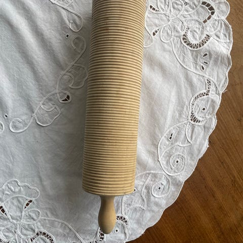 Rutekjevle til lefsebaking. Lengde 37 cm + håndtak. Med håndtak 57 cm. Dia: 8 cm. Fast. Kjevlet har noen hakk på ene sida, fint til kjevling. Selger kr.350,-. Tar vipps. Sender Norgespakke 140/PostNord 69.