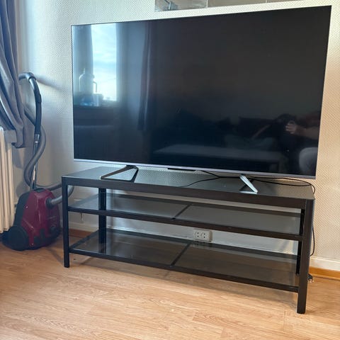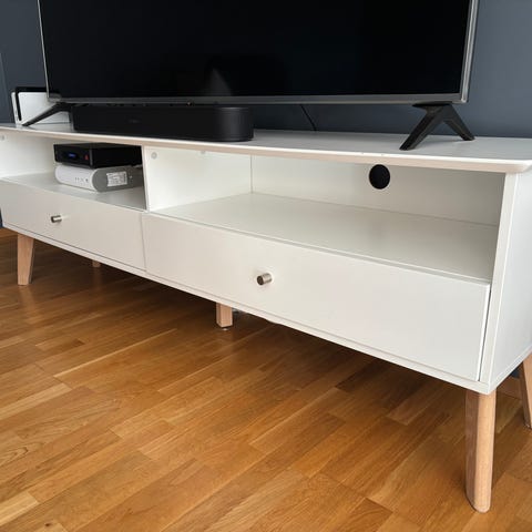TV-bank fra Møbelringen. Vi har en 49 tommer tv stående på den. To skuffer med oppbevaring.