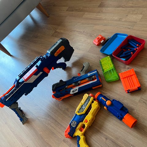 Selger diverse nerf og air balster pistoler som er gøy for mindre barn og leke med. Noen har sugekopp skudd mens noen har vanlige nerf skudd. Den store røde har kuler og er litt mer kraftig enn de andre, men bruker batteri istedenfor de andre som kan brukes som de er. Den største blå er litt dårlig fordi noen av skudd hullene ikke gir nokk kraft til at skuddet skytes langt nokk ut. Resten funker som de skal! Jeg selger disse fordi jeg ikke lenger leker med de selv. Men jeg hadde fortsatt mye morro med kompisene mine når vi lekte med disse. Vennligst ta kontakt om det er noe du lukter på. Det er også mulig å kjøpe bare en eller alle! Kom med tilbud til pris om du er interessert i å kjøpe😁