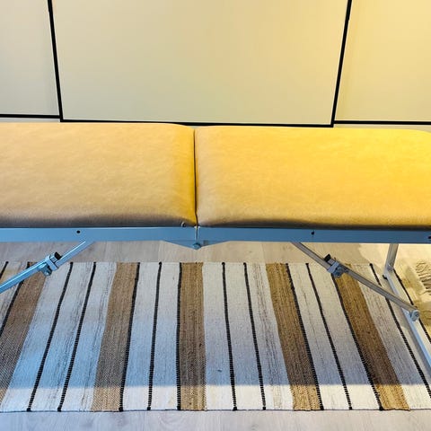 Avendo Life massasje- og behandlingsbenk i beige farge med treramme. Benken har polstret overflate og sammenleggbar design for enkel transport og oppbevaring. Passer til bruk innen massasje og behandling. Benken viser noe slitasje på polstringen.
