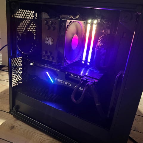 Stasjonær Gaming PC med 2 skjermer, mus og tastatur, musematte, mikrofon, webcam, og et hjørnebord.