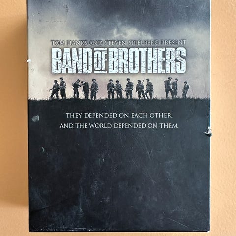 Band of Brothers DVD bokssett med flere disker, inneholder krigsdrama. Bokssettet har et omslag med bilder av soldater og krigsscenarier. Inneholder originalt cover og flere DVD-plater.