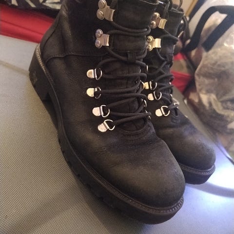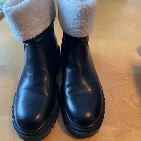 Godt brukt vinterstøvel i ekte saueskinn. Veldig varme, nylig innsatt med fett og med termisk såle. Enkel å ta på seg takket være glidelås i siden.