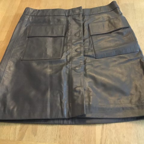Skinnskjørt i mykt semsket skinn med råkant nede og skjult glidelås bak.