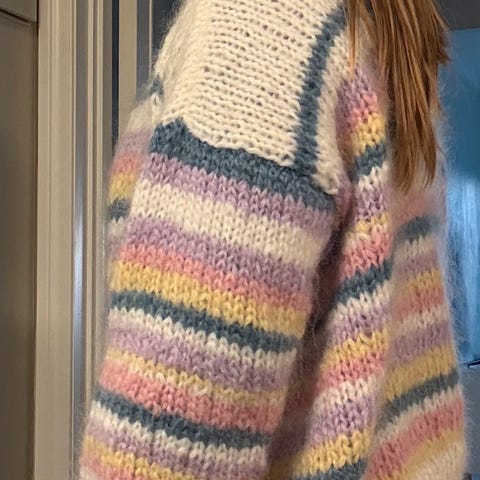 Tamara hjemmestrikket cardigan selges. Strikket med dobbelt garn i str. M. Veldig myk og god og i herlige og friske farger.