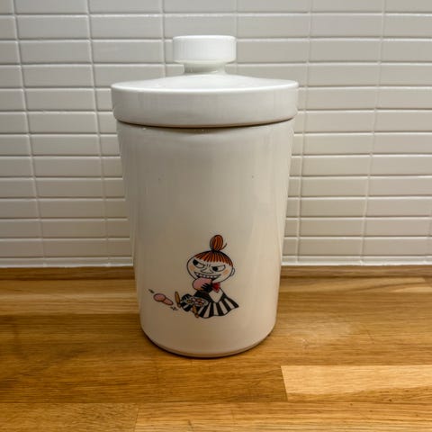 Mummi kakeboks/kjeks krukke i keramikk. Hvit med motiv av lille My og Stinky i bunnen på innsiden.