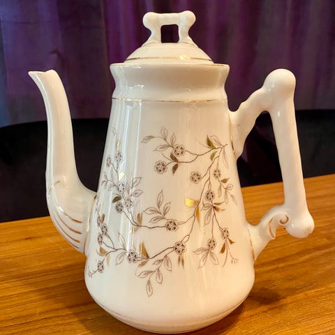Eldre the/kaffekanne med gull skrit. Jeg Gratulerer