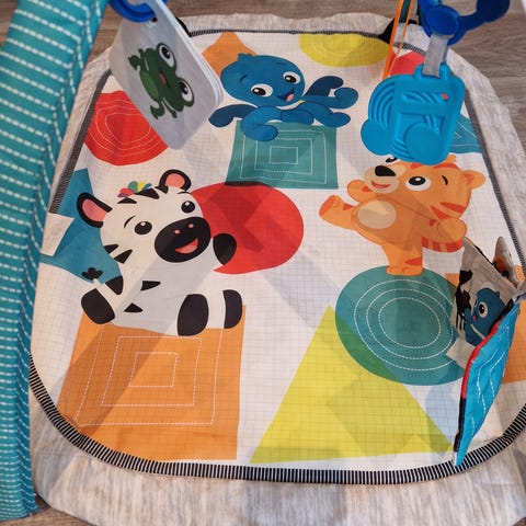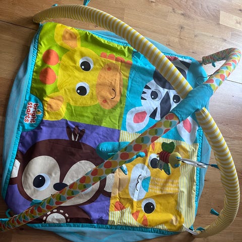 Fargerik babygym med leker og baller. Kanten rundt kan brettes ned, og lekene flyttes til ulike posisjoner på buene. Pebt brukt, men speilet er litt slitt etter vask og det er et par små flekker på selve matten (se bilde).