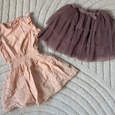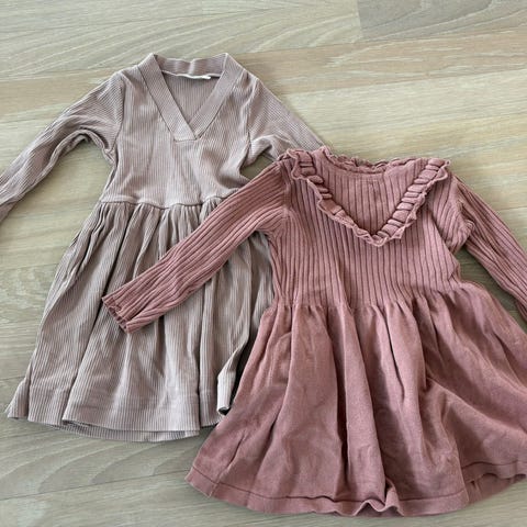 POMPdeLUX . Kjolene er lilla og laget for barn. Den ene har lange ermer og en løs passform med knapper foran. Mens den andre rusjer med gullkanter Materialet er mykt og egnet for hverdagsbruk.