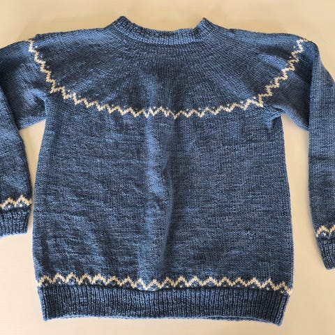 Kongeblå og søt strikket jenser i mykt garn selges ubrukt for 150kr. Den er strikket svært pent og har mange fine detaljer som mønster og «splitter» passer til både gutter og jenter. Saue knapp i nakken.