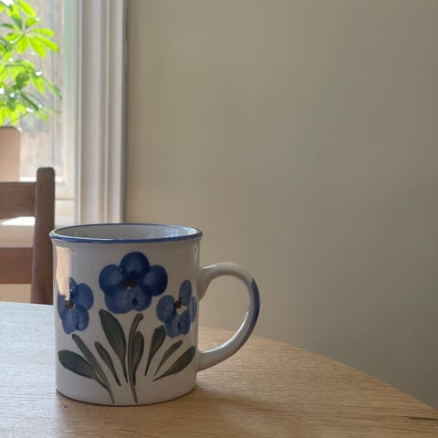 Søkeord: krus kopp kaffekopp kaffekrus tekopp tekrus ceramic hank blå blomster landlig landstil cottagecore cottage core blader grønn hvit kvitt kjøkken kaffehjørne kjøkkenutstyr dekor dekorasjon interiør pynt pyntegjenstand