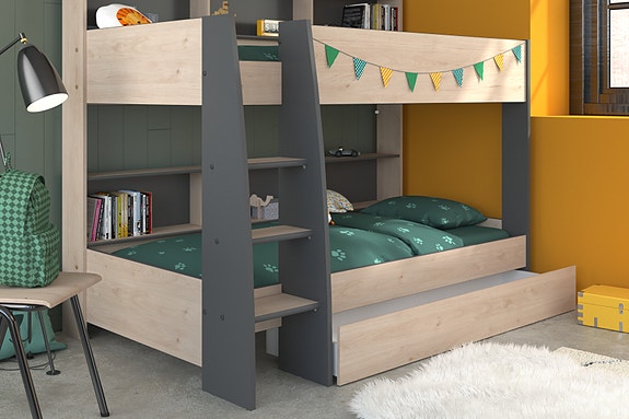 Den praktiske pulten gir studenten et flott skrivebord når det skal gjøres lekser. Enheten kan enkelt trekkes tilbake under sengen når det ikke er behov for denne.