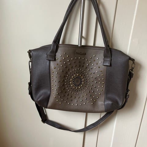 Desigual dame veske laget av kunstlær i brun farge. Vesken har broderte mønstre i flere farger på forsiden. Den har to håndtak og en avtagbar skulderrem. Inne i vesken er det foret med rødt stoff og har en innerlomme med glidelås. Vesken lukkes med en magnetisk knapp.
