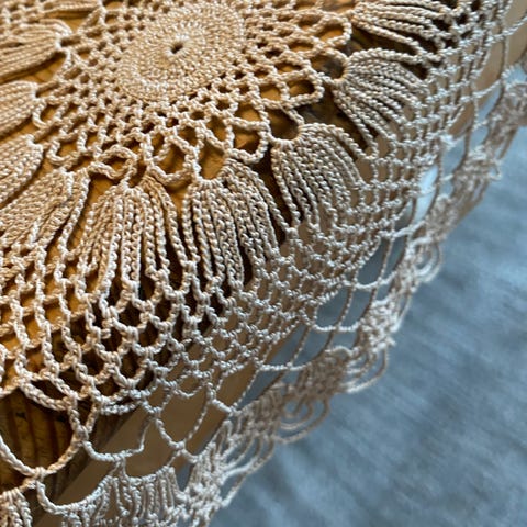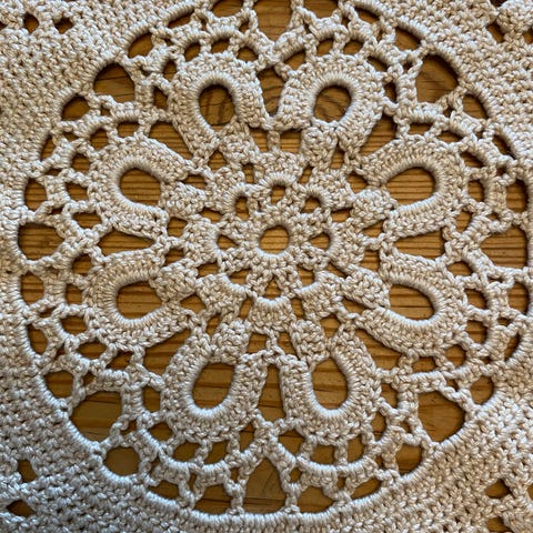 Veldig vakker retro heklet rund duk med fyldige roser, hånd arbeid, 100 % bomull
