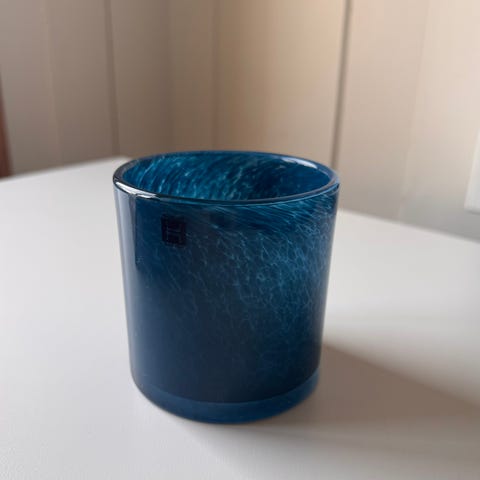 Helt ny lysestake med lys. Ubrukt med lapp på. Blågrå