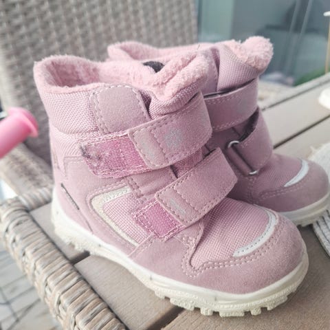 Fila barnesko for jente i størrelse 23. Skoene har en beige farge med rosa detaljer og lisser. Materialet er robust med godt mønster under sålen for grep. Egnet for utendørs bruk i ulike værforhold.