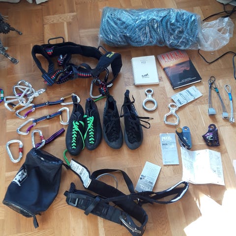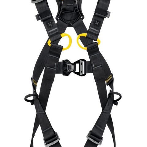 Petzl sele og klatreutstyr inkludert flere karabinkroker, taubrems og justerbare stropper. Utstyret er laget for klatring og sikring, med materialer som nylon og metall. Passer for bruk i ulike klatresituasjoner og sikkerhetsoppsett.